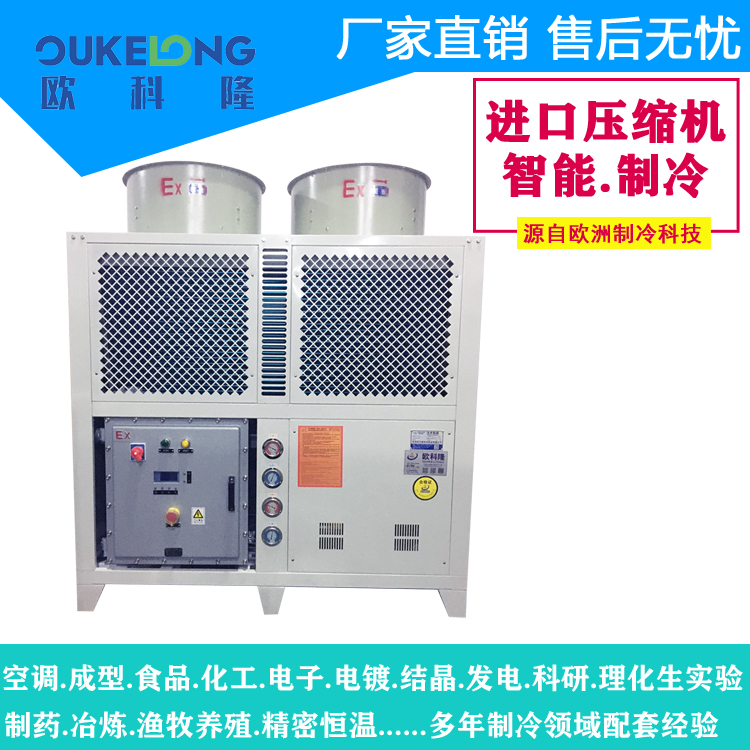歐科隆15匹防爆冷水機(jī)專為化工、制藥、鋰電池等易燃易爆環(huán)境研發(fā),通過國家Ex dⅡBT4防爆認(rèn)證,整機(jī)采用防爆壓縮機(jī)、防爆電控系統(tǒng)及無火花元件,確保危險(xiǎn)場所安全運(yùn)行,為關(guān)鍵生產(chǎn)流程提供可靠制冷保障。
