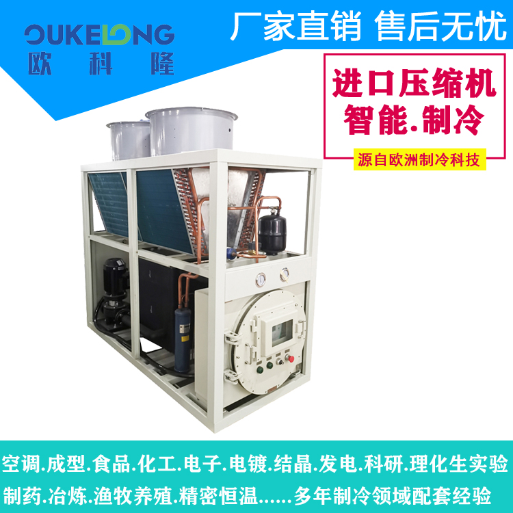 風(fēng)冷箱式防爆冷水機,是歐科隆制冷打開市場的拳頭產(chǎn)品,歐科隆制冷擁有廣泛的防爆冷水機配套經(jīng)營,包括臭氧發(fā)生器,甲烷發(fā)電,化工化纖,石油天然氣,新型環(huán)保行業(yè)等,歐科隆防爆冷水機采用隔爆、增安、本安、正壓、充油、充砂、無火花、澆封和氣密等多種防爆方式,使機組可以在易燃易爆場合使用。