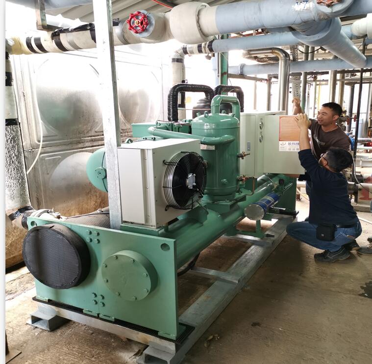 冷水機組包括很多種,而螺桿式冷水機則為其中較為重要的一種,因其關鍵部件-壓縮機采用螺桿式故名螺桿式冷水機。機組由蒸發(fā)器出來的狀態(tài)為氣體的冷媒;經(jīng)壓縮機絕熱壓縮以后,變成高溫高壓狀態(tài)。被壓縮后的氣體冷媒,在冷凝器中,等壓冷卻冷凝,經(jīng)冷凝后變化成液態(tài)冷媒,再經(jīng)節(jié)流閥膨脹到低壓,變成氣液混合物。其中低溫低壓下的液態(tài)冷媒,在蒸發(fā)器中吸收被冷物質(zhì)的熱量,重新變成氣態(tài)冷媒。氣態(tài)冷媒經(jīng)管道重新進入壓縮機,開始新的循環(huán)。這就是冷凍循環(huán)的四個過程,也是螺桿式冷水機的主要工作原理。